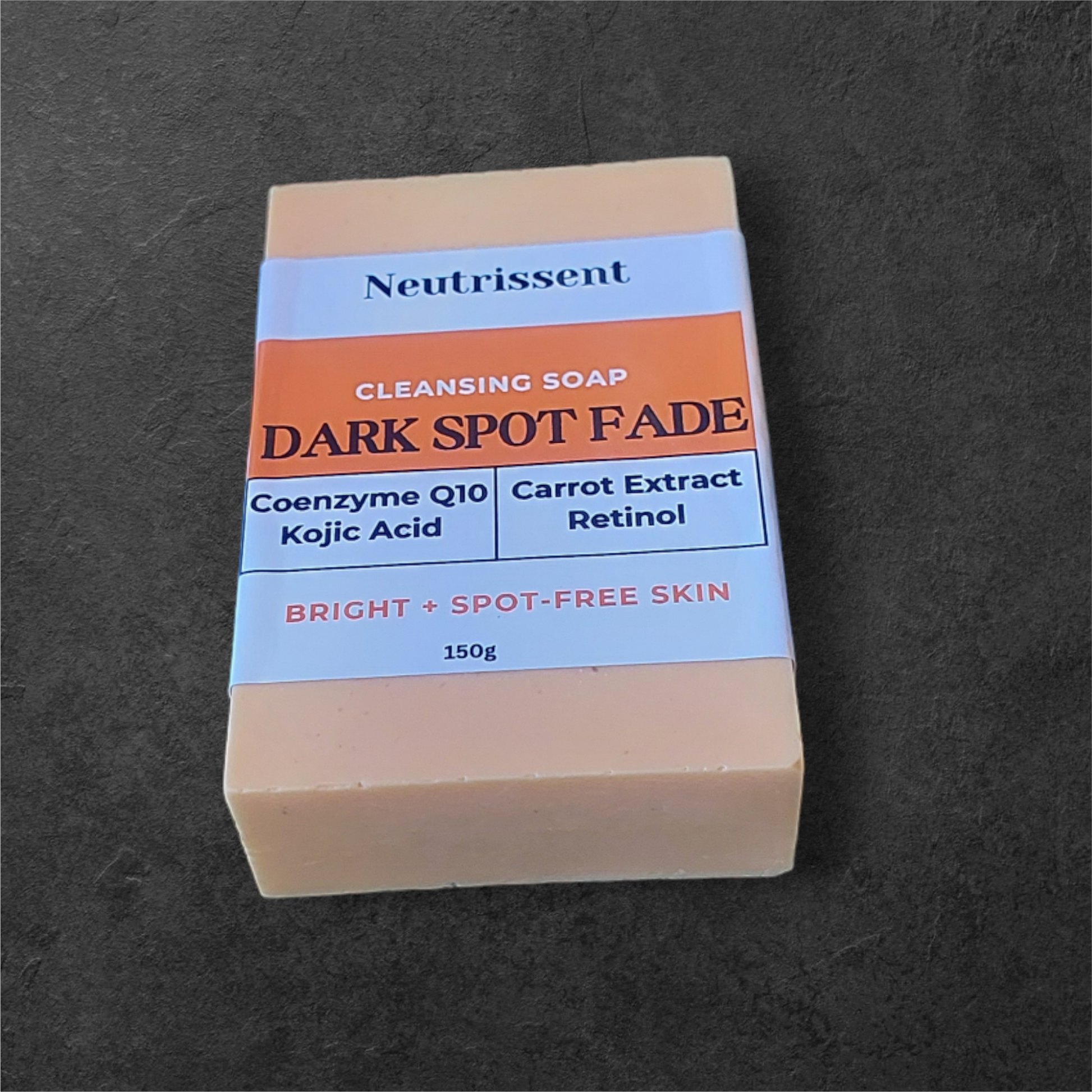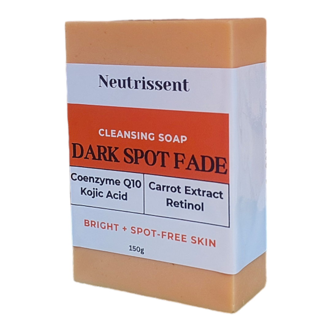 Neutrissent dark spot fade soap bar is enriched with coenzyme Q10,kojic acid,retinol and carrot extract to deeply cleanse and give your skin a natural glow. Consistent use will result in an even skin tone and reduced dark spots